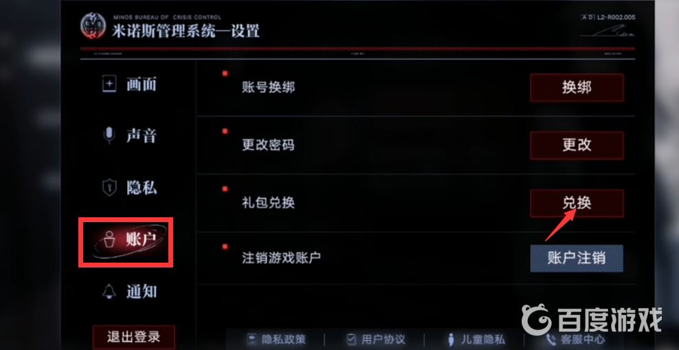 3、接着在设置列表左侧找到账号,点击礼包兑换进入。