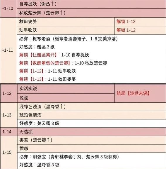 11:救田婆婆,解锁1-13;动手收妖,解锁1-12;必穿:栀寒老酒(栀寒老酒套裙子,1-6完美掉落);好感度:鞋丞3级;解锁【让谢丞离开】:1-10自荐捉妖;解锁【救醒晕倒的楚云卿】:1-10私放楚云卿;解锁1-12:1-11动手收妖;解锁1-13,1-11救田婆婆。