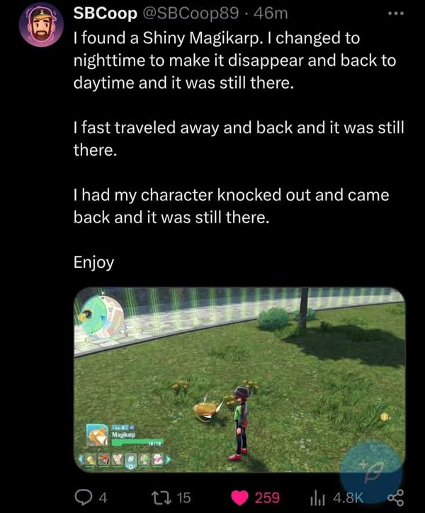 此机制已获玩家社群广泛验证。Reddit论坛上,有玩家分享在遭遇闪光鲤鱼王后,通过离开场景、调整游戏内时间週期等操作进行测试,返回时该闪光个体依然存在。多轮测试显示,时间流逝或地图切换均不会导致闪光宝可梦消失。此设计彻底解决了历代作品中闪光宝可梦“稍纵即逝”的问题,结合最多10只闪光的存储上限,为玩家打造更宽鬆的稀有宝可梦收集环境。