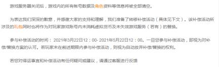 2.2021年3月22日12:00,停止游戏充值,停止新用户注册和渠道下架,并关闭所有下载渠道2021年3月22日12:00,发放停服全服福利2021年5月22日12:00,正式停止游戏运营,关闭游戏服务器,玩家无法登陆游戏,游戏官网、微信公众号和专属客服关闭。