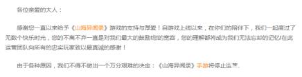 1.官方发布:由于各种原因,我们不得不做出一个万分艰难的决定:《山海异闻录》手游将停止运营。