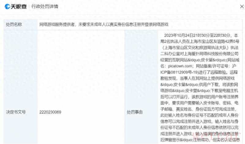 处罚事由显示,此前,上海市宝山区文化和旅游局执法人员对爱扑公司经营的网站皮卡堂进行远程勘验发现,该款游戏的用户账号注册界面中,要求用户输入皮卡账号、密码、电子邮箱、真实姓名、身份证后方可完成注册,此处输入姓名与身份证号不匹配的成年人身份信息可以完成注册并进入游戏。输入错误的身份信息注册后弹窗显示注册成功但实名认证信息未通过,完成加载后可以正常进入该款游戏。