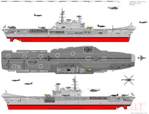 经过改进,加装完滑越甲板的航母,更加接近现代航母了,该舰全长236.1米,宽27.4米,吃水深度8.8米,满载排水量28000吨,动力采用2部蒸汽㶽炉(76000匹马力),最高航速28节,武器为5座40毫米口径双联装高炮,搭载舰员2100人,能够搭载28架海鹞垂直起降战机和9架海王直升机。