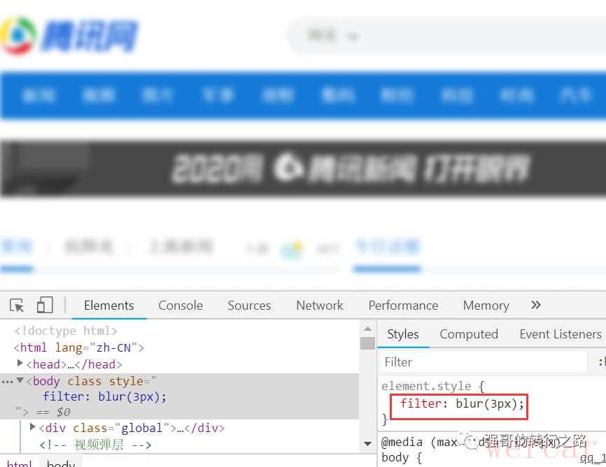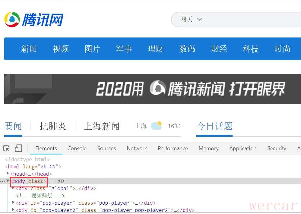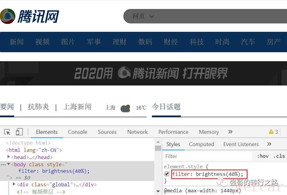 首先我们打开腾讯网的首页,按F12进入浏览器控制台,强哥猜测应该是改的整体的样式,估计是在body标签上直接加的样式。