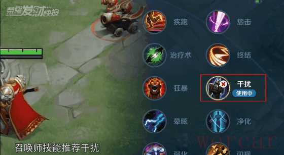 召唤师技能推荐干扰。尽管在10月25日的正式服更新中,官方对干扰进行了削弱,但是干扰依旧拥有很好的压塔推进效果。