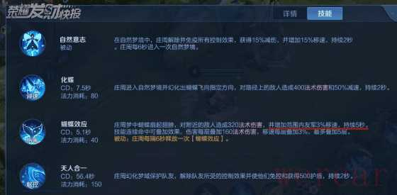 "特点:" 梦蝶皮肤拥有极高的颜值和独特的技能特效(尤其是大招的蝴蝶效果),并且其技能机制(尤其是大招的免控效果)使得庄周在团战中非常难以被控制,是公认的控制反制大师。