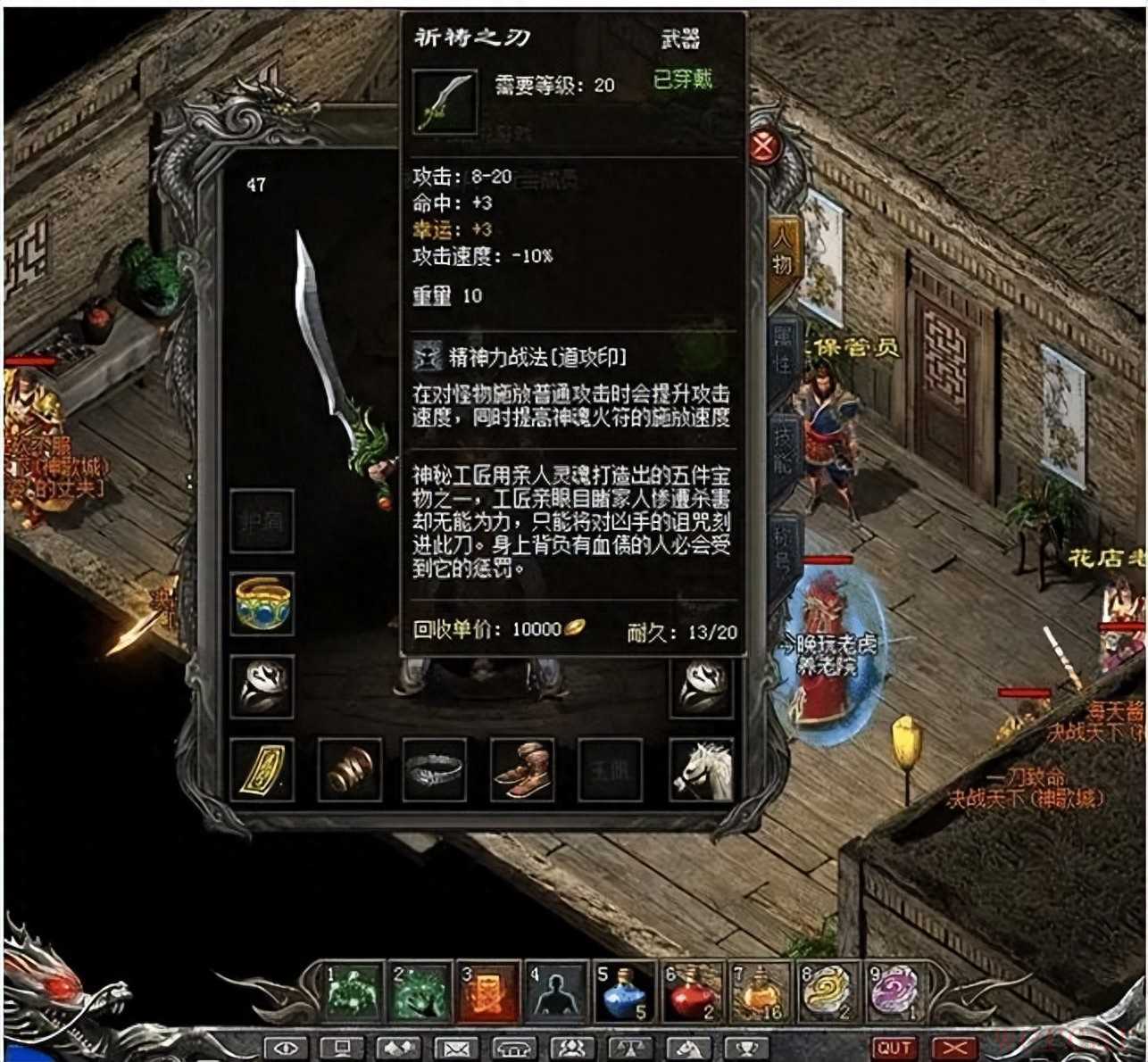这把剑的属性在早期传奇中堪称“异类”。它攻击上下限非常均衡(8-20),意味着输出极其稳定。更可怕的是,它自带+3的准确,对于攻击经常被MISS的战士来说,简直是前期PK神器。重量只有1点,任何职业都能轻松拿起,导致出现了大量手持祈祷之刃的道士和法师,近身攻击效率惊人。