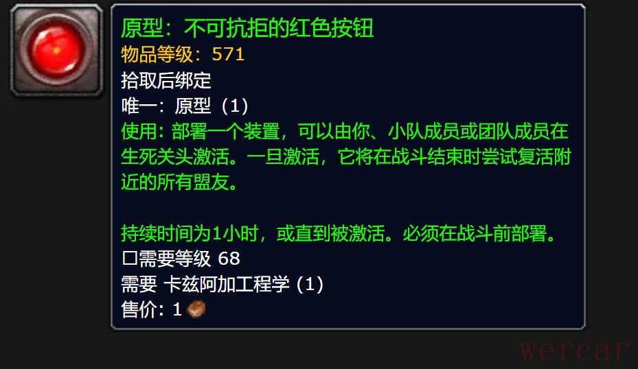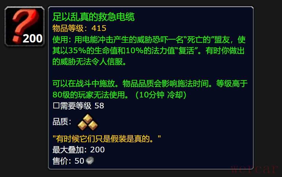 充能还需要电线“足以乱真的救急电缆”,这是一件《巨龙时代》版本的工程物品。在地心之战,依然有很多没有战复技能的玩家使用它在大秘境拯救队友,唯一的缺点是需要读条。