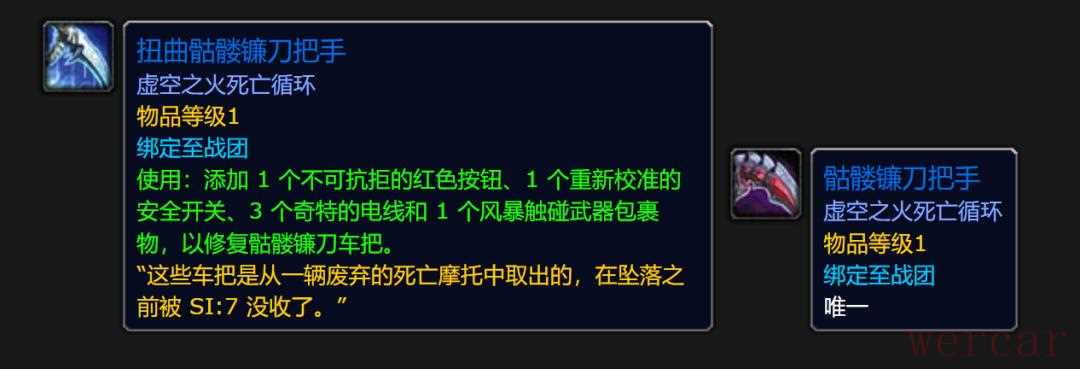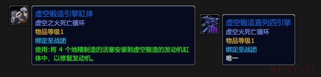 从摩托车的描述看,玩家通关全新的大幻象玩法(或者使用代币兑换)后会随机掉落虚空锻造引擎缸体、魔力流形虚空、扭曲骷髅镰刀把手、虚空伤痕猪皮、耗尽的虚空水晶、触手辐条和抵抗虚空火焰之皮这7种零件(战团绑定),但是这些零件都是破损的,我们需要使用专业技能将它们全部修复,然后将修复好的零件组装起来,就可以获得一台全新的魔能机甲亡命摩托。