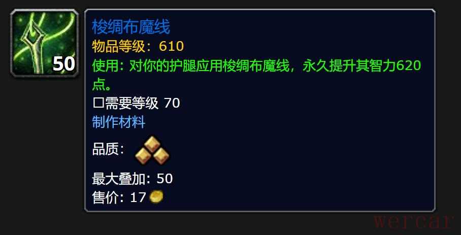 裁缝将负责制作该坐骑的座椅,并需要使用最高品质(三星)的梭绸布魔线5条。