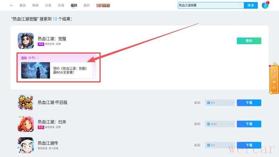 2、进入福利中心界面后,若主页直接展示有《热血江湖:觉醒》相关福利板块,点击进入即可;若主页未显示,可在右上角搜索框输入 “热血江湖:觉醒”,搜索并进入游戏福利页面