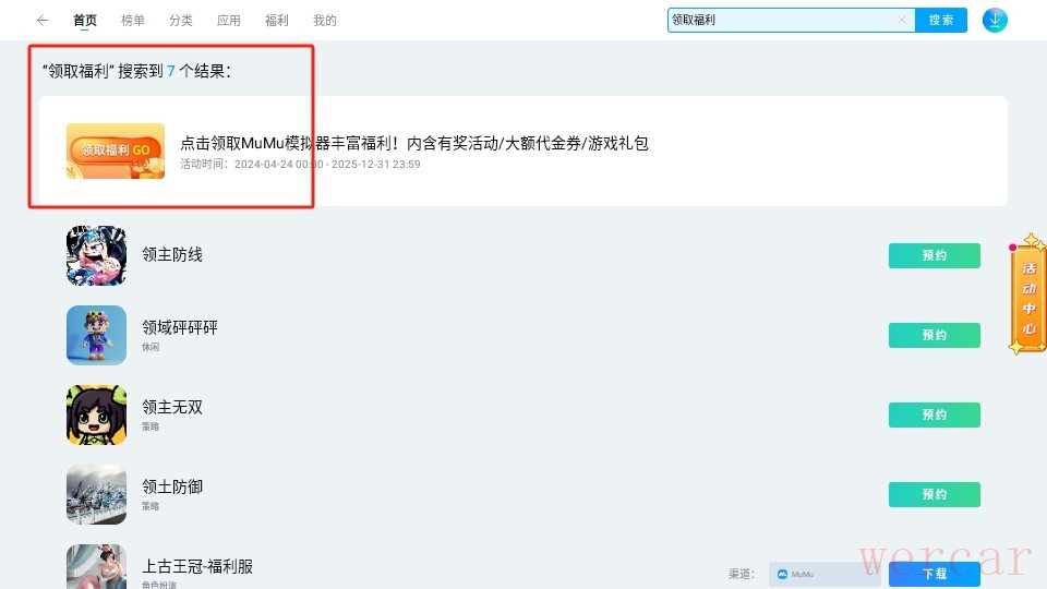 1、在MuMu模拟器桌面的搜索框中输入 “领取福利”,点击打开福利中心