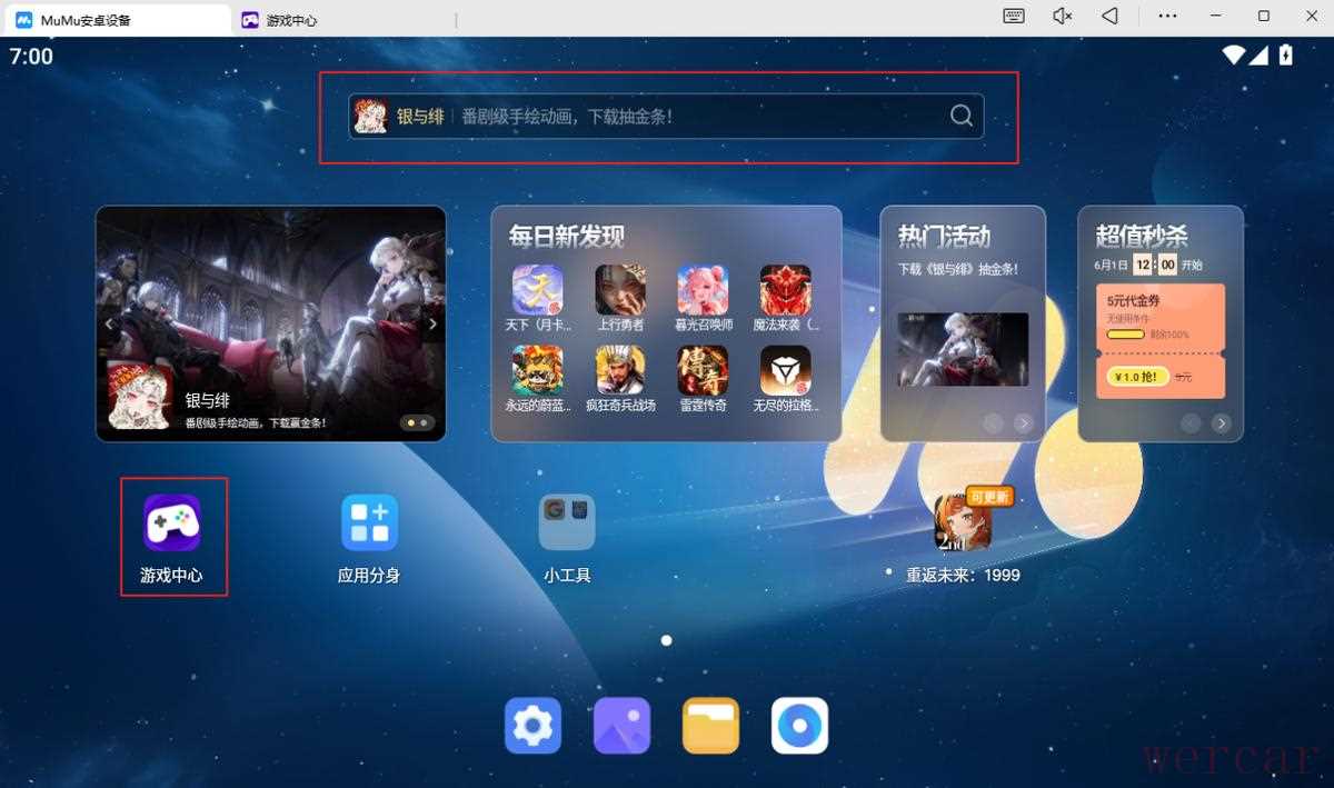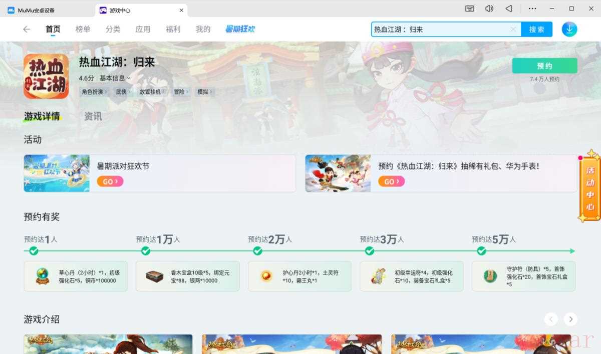 方法一:启动模拟器,进入桌面“游戏中心”,搜索“热血江湖:归来”,点击预约,待游戏公测开启即可畅玩;