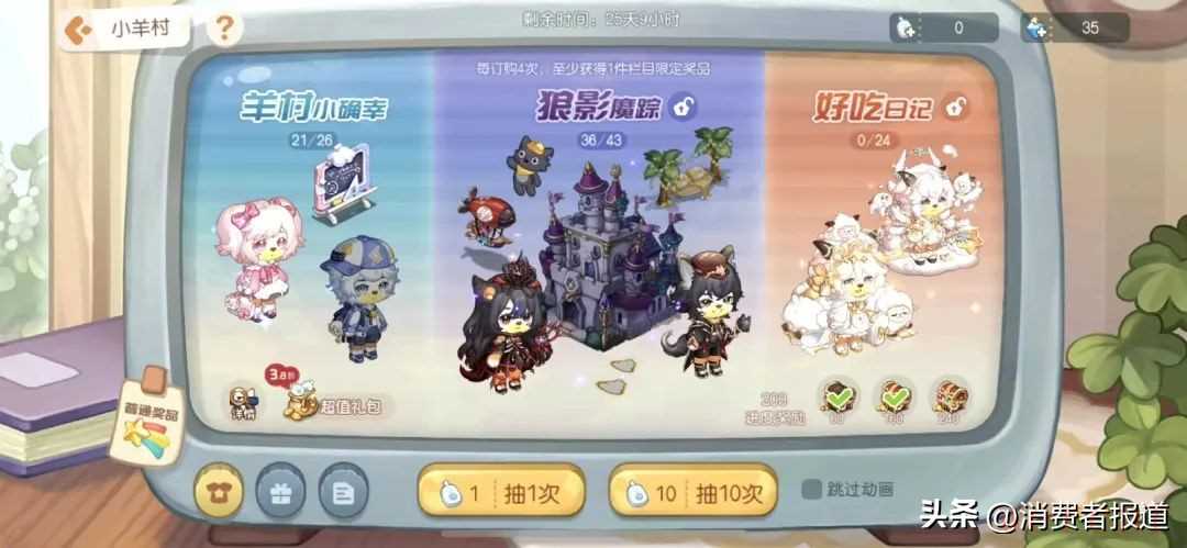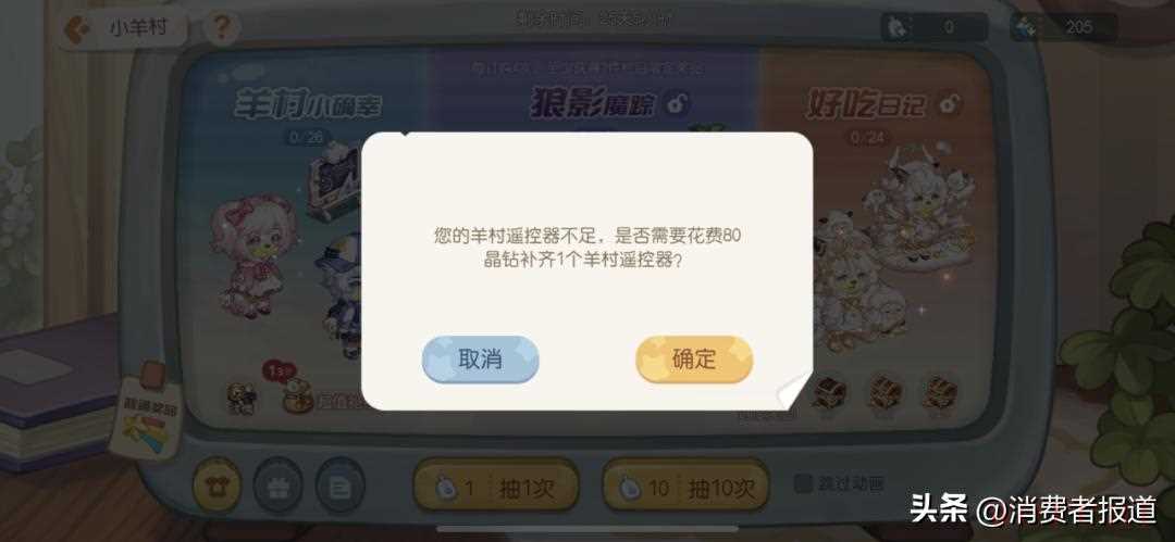 官方信息显示,最高372抽可获取所有限定奖品。根据游戏规则,每抽一次需要消耗一个“羊村遥控器”,“羊村遥控器”可通过任务、晶钻、礼包购买获取。若以通过晶钻获取,则需要花费80晶钻兑换1个“羊村遥控器”。玩家小艺(化名)告诉记者,玩家只要完成日常任务就能获得50晶钻。若想抽取心仪的限定奖品,光凭免费的晶钻领取数量难以实现,最快获得晶钻的途径是充值。