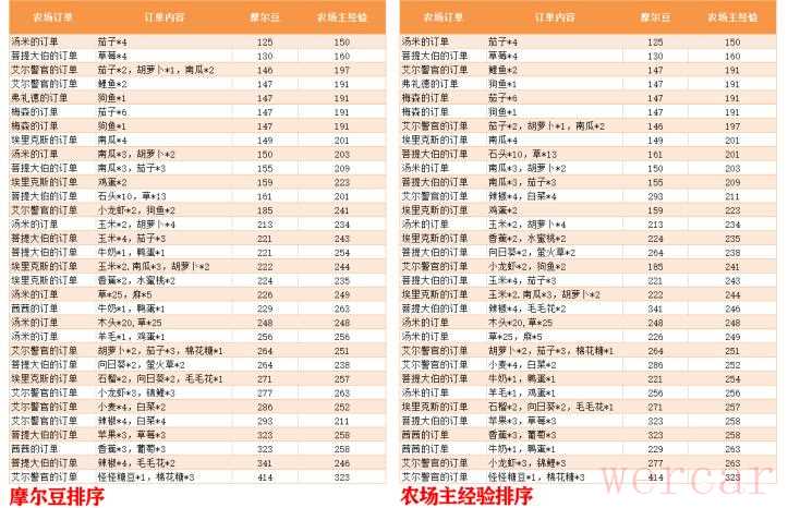 农场订单也是随农场主到一定的等阶而增加,示例:6级时每日可做订单量为6个,31级时为9个;部分订单内容如下,这里按摩尔豆/农场主经验列出,由下图可看出,完成不同的订单所获得的摩尔豆和农场主经验差别还是比较大的;同样,订单刷新次数不限,可免费加速5次,超出5次再加速,需消耗金豆。假设可完成订单数为6个,只完成获得摩尔豆为256个或以上的订单,餐厅订单部分每日可获得1536摩尔豆。