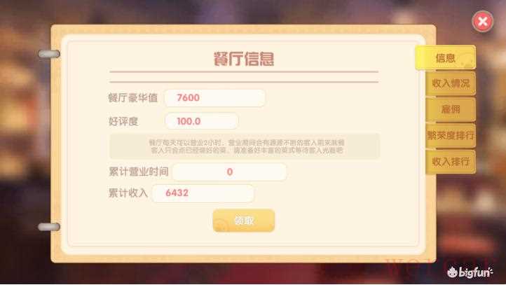 同样的条件,中级餐厅,豪华值为7600,好评度为100,上架1079份浆果烧饼,经营接近1小时,卖出243份,余836份,收益为1763;相较烧烤拉姆,主要还是吃得慢,从上菜到吃完走人,用了2分钟左右,1小时的收益真的低太多了,lz近期非常缺豆,剩下的1小时换了烧烤拉姆,上架440份,售出346份,收益为3030摩尔豆;浆果烧饼+烧烤拉姆,今日累计收益为4793摩尔豆。
