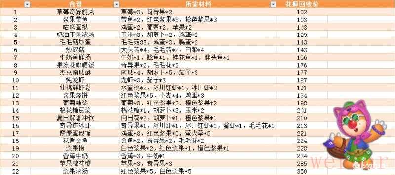 这里列出部分花婶回收价高于100摩尔豆的食谱及相应食材来源,私房菜每日可快速制作5份,剩下的只能挨个手动制作,如果不想刻意大量制作,建议每天把5次快速制作消耗完;1份浆果捞售价228,1天5份就是1140摩尔豆,10天就是11400。