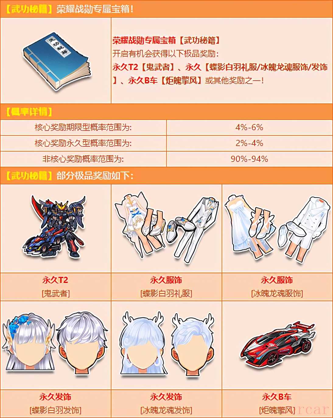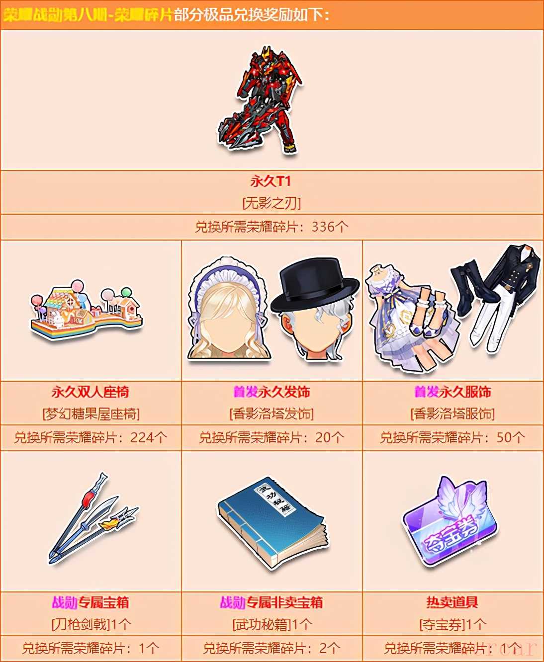 参与荣耀战勋第8期,消耗荣耀碎片,可兑换永久T1【无影之刃】、永久双人座椅【梦幻糖果屋座椅】、首发永久【香影洛塔发饰/服饰】。还可获得超值海量丰厚奖励【武功秘籍】、【刀枪剑戟】、【初级魔法合成卡】、【万能咕噜球】、【夺宝券】、【效率宝珠LV1】、【坚韧宝珠LV1】、【重生宝珠LV1】等。另外,开启荣耀战勋专属宝箱【武功秘籍】,有机会获得永久T2【鬼武者】、永久【蝶影白羽礼服/冰魄龙魂服饰/发饰】、永久B车【炬魄擎风】或其他奖励之一!