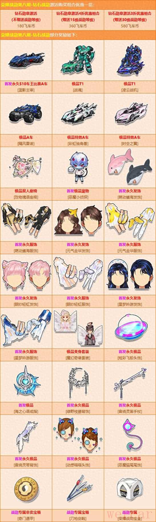 参与荣耀战勋第8期,有机会获得首发主题A车【蓝影主宰】、极品A车【飓风雷诺】、首发极品宠物【恶魔小侦探】、首发永久【萌动鲨鱼/元气金华/眠纱轻虹/星梦吟游发饰/服饰】、首发永久【音绕灵笛手杖/炫彩飞船头饰/绿野枝藤背饰】。除以上极品外,还有机会获得极品道具【荣耀战勋宝盒】,开启可获得荣耀碎片,使用荣耀碎片即可兑换以下极品奖励: