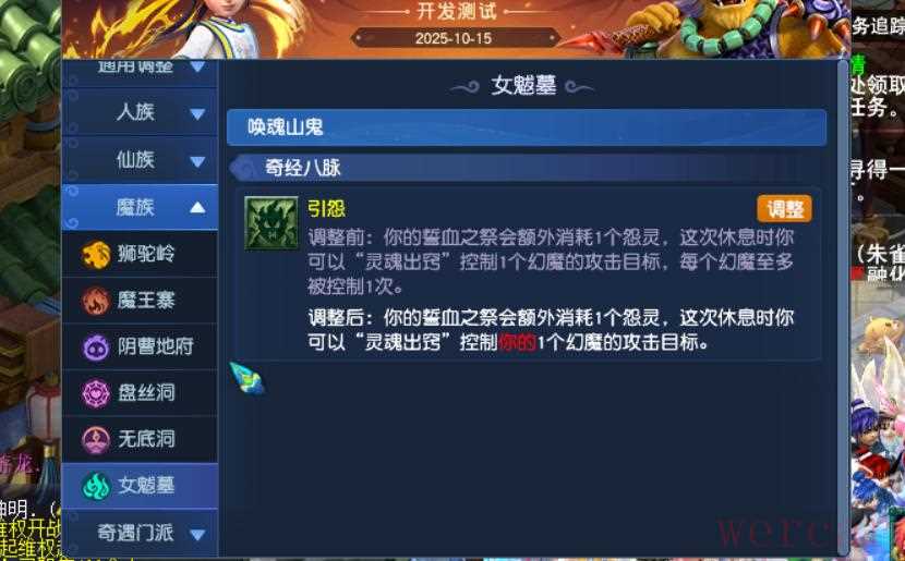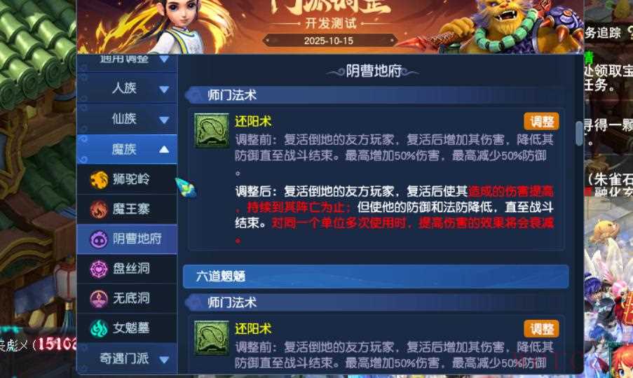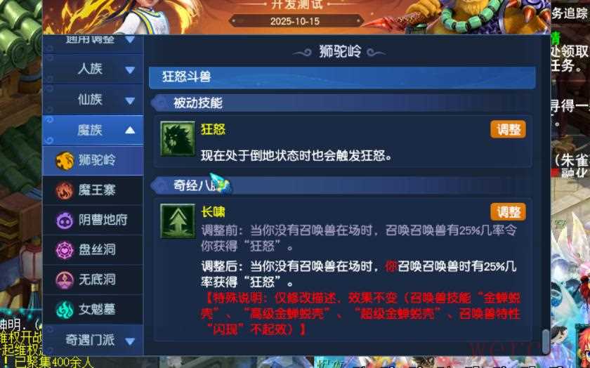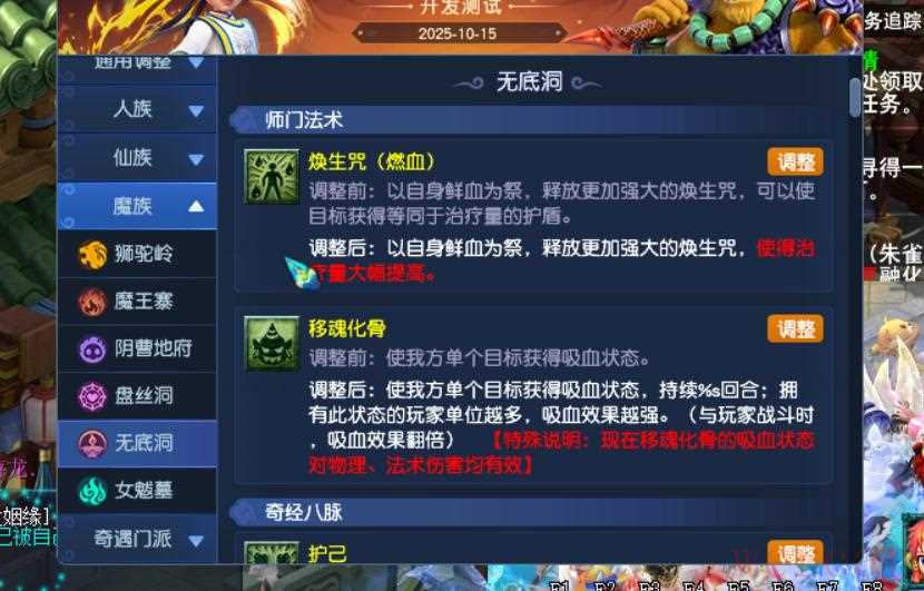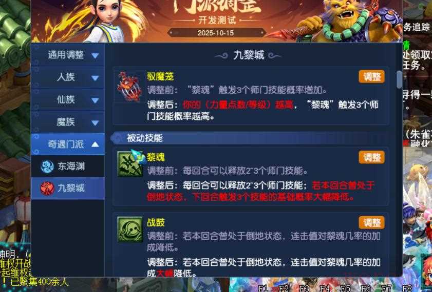 20、九黎城多个师门被动削弱,驭魔笼要求力量点数/等级的比例。黎魂多了一个,若当回合曾处于倒地,下回合触发3技能大幅度降低。战鼓也增加了同样的限制。