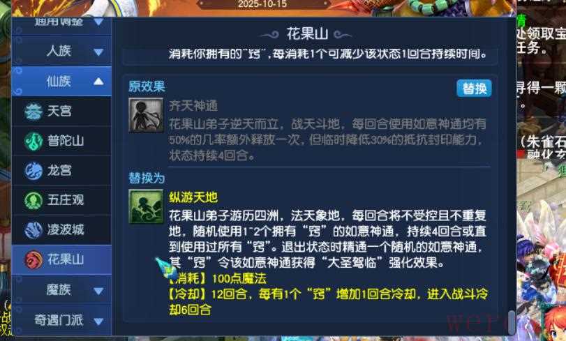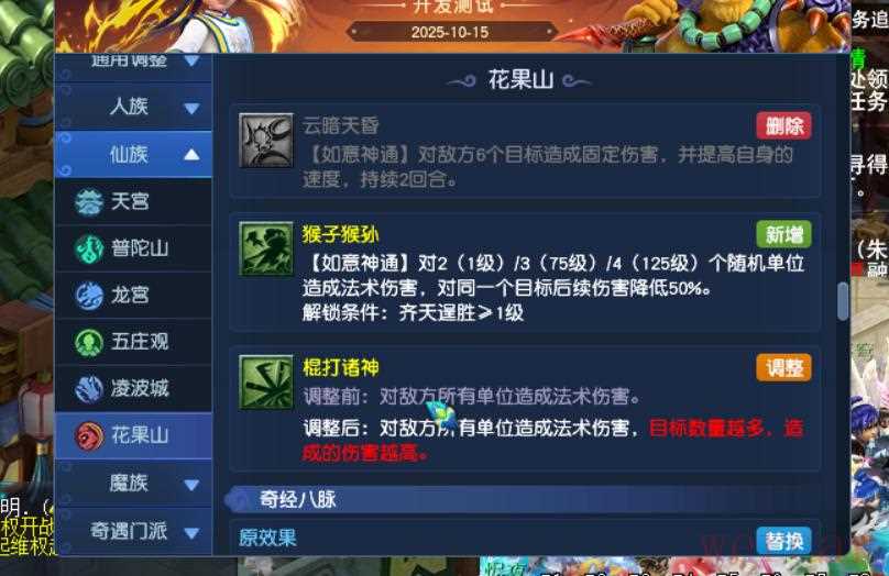 新增师门技能猴子猴孙,对最多4个随机单位造成伤害,魔花果流派则是造成法伤。
