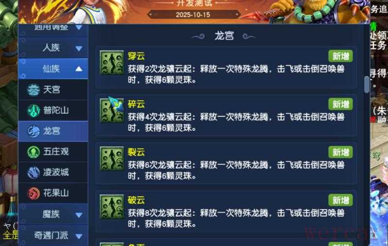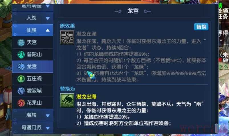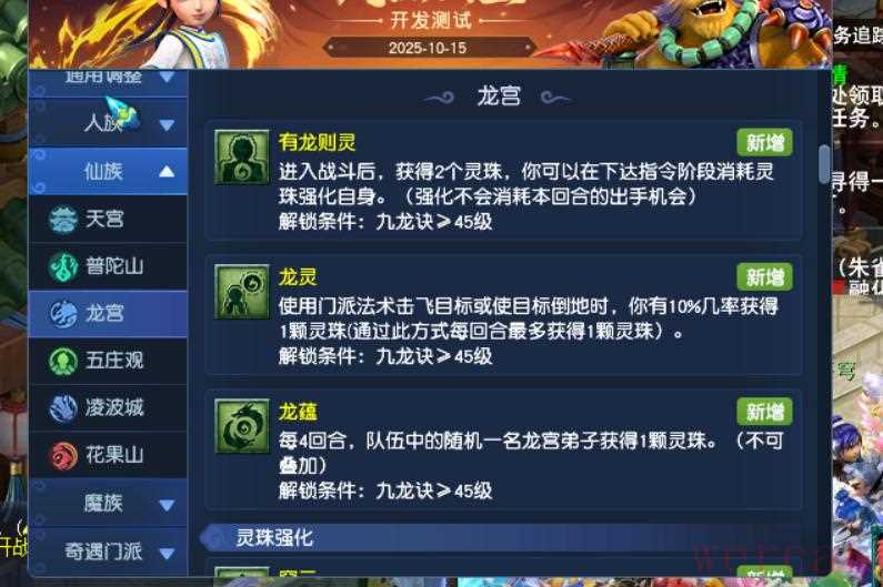 龙宫第三经脉潜龙沧海重做,增加灵珠的设定,消耗灵珠会强化自身。龙灵,门派法术击倒或者击飞目标,有10%几率获得灵珠。龙蕴,每4回合,队伍中随机一名龙宫弟子获得灵珠。