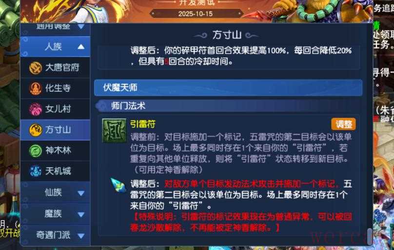 4、方寸伏魔天师流派师门技能引雷符改动,原本只是增加一个标记,现在是增加标记并且发动一次法术攻击。