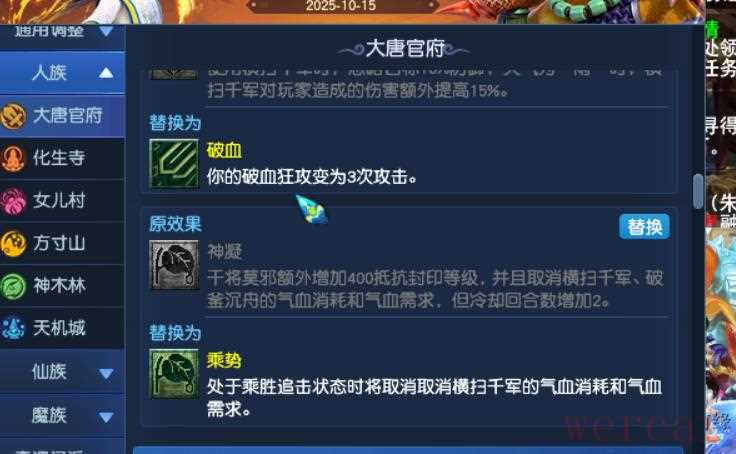 原来的勇念丹现在改成破血丹,效果是破血变成3次。以后大唐带个破血特技,要起飞了,不休息无限打三次,或者用技能打还能忽视防御。虎贲大唐的灵能经脉改成,干将莫邪改为增加法伤。