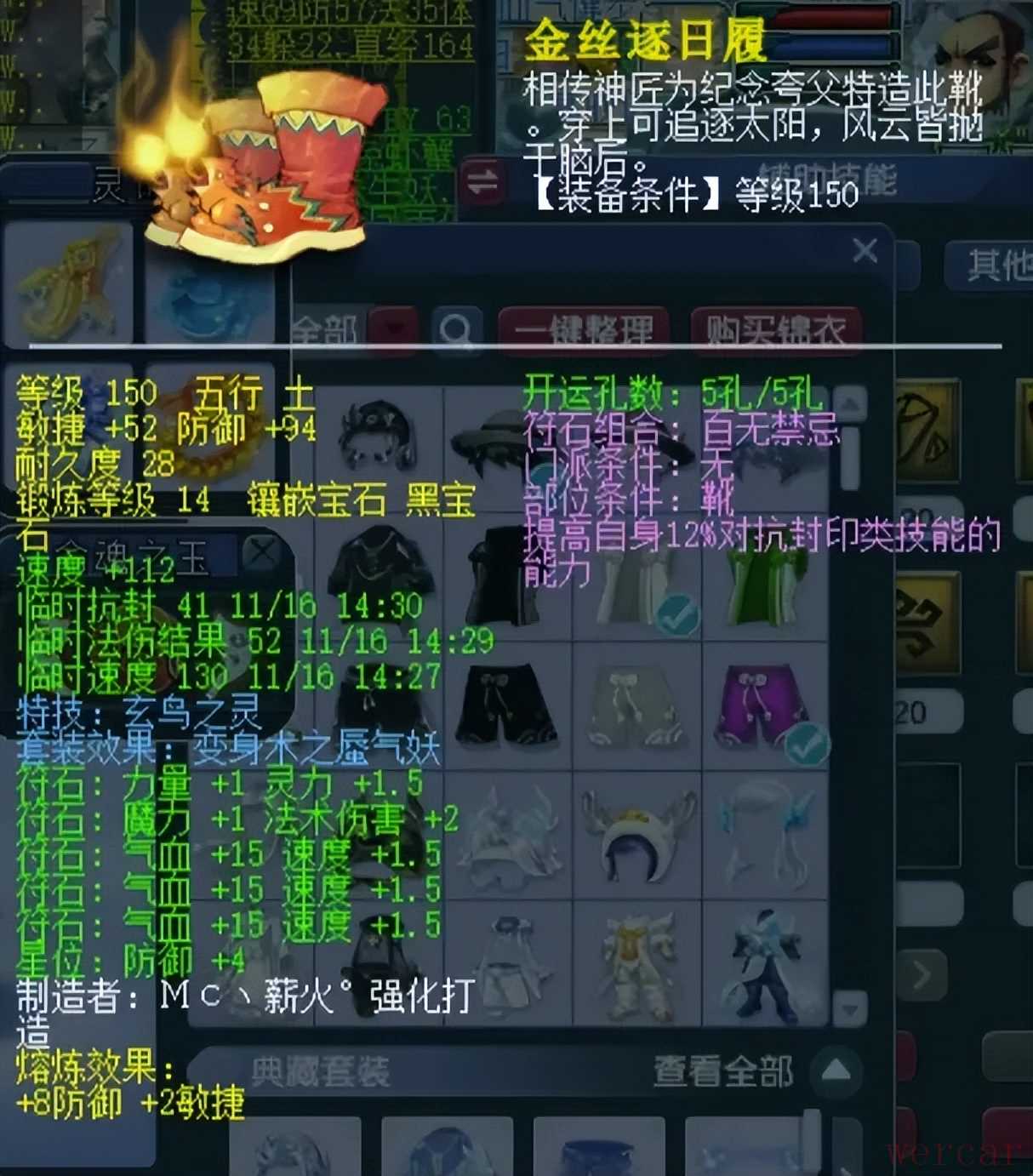 150级玄鸟鞋子,熔炼后敏捷54、防御102,镶嵌14锻黑宝石。玄鸟是增加法伤用的,属于核心特技之一。