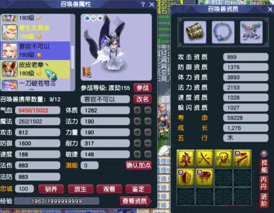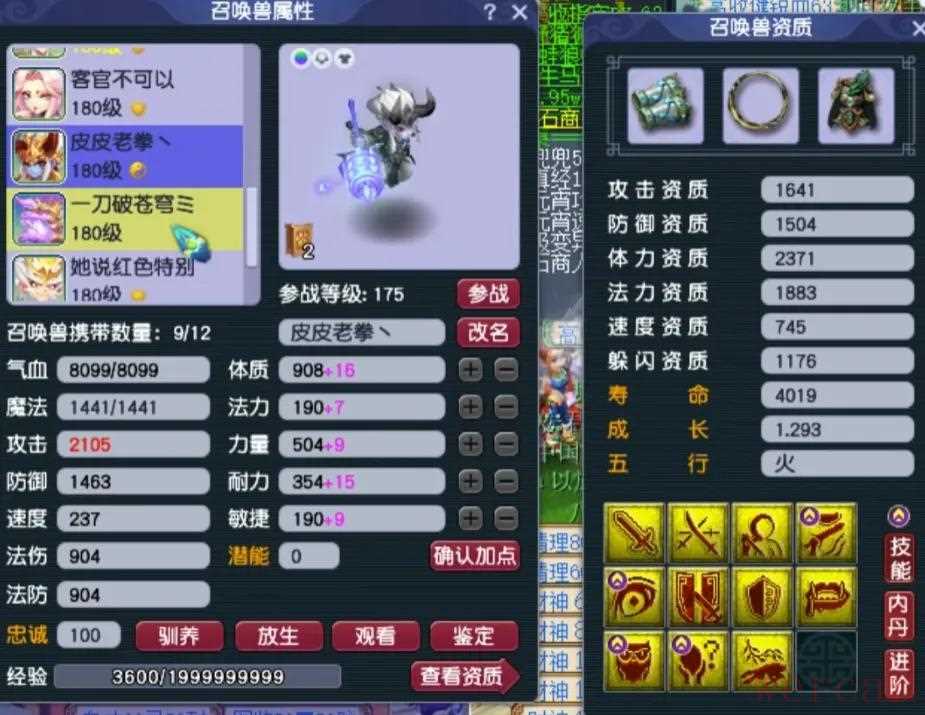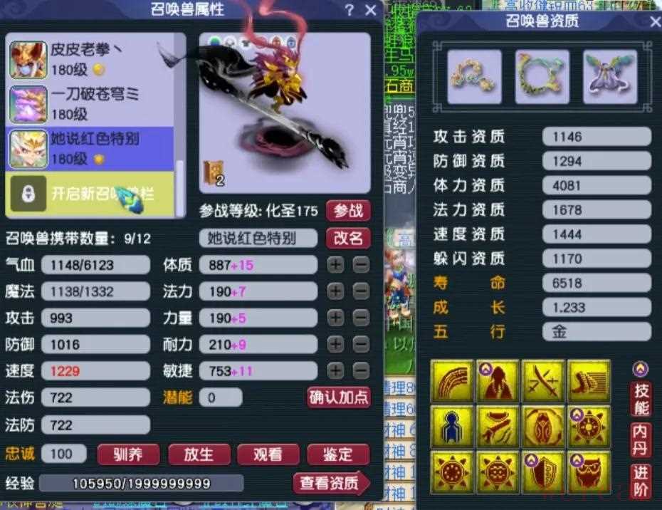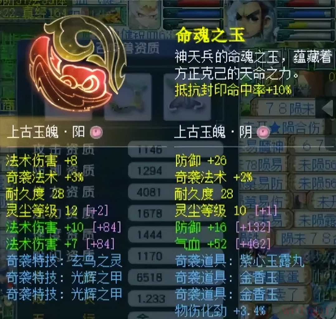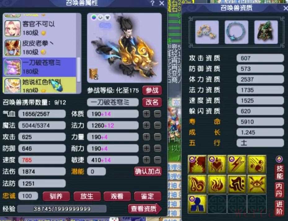 阳玉魄是三法伤,阴玉魄是双防御一气血带3.4%物伤化劲,平均五色灵尘是11级。4、召唤兽展示