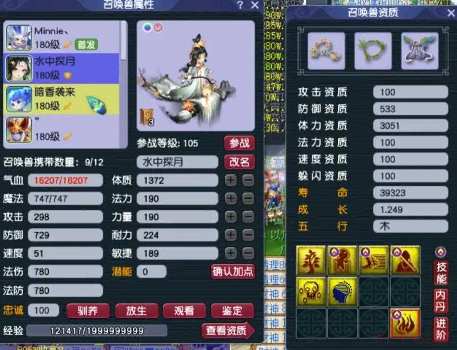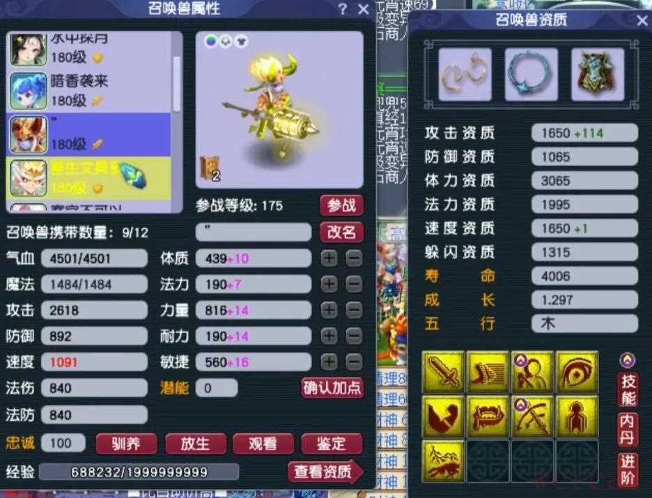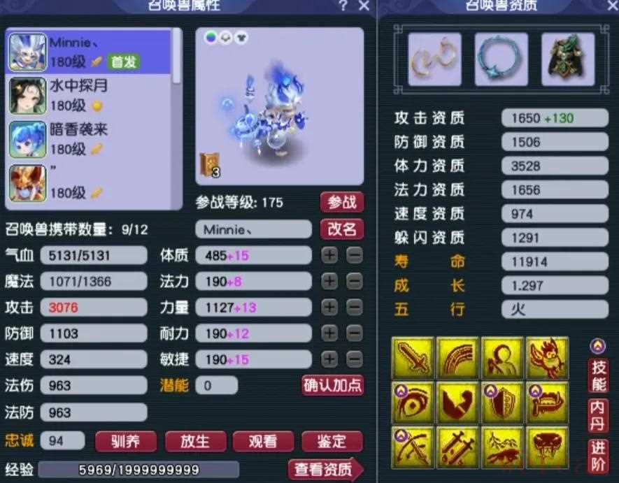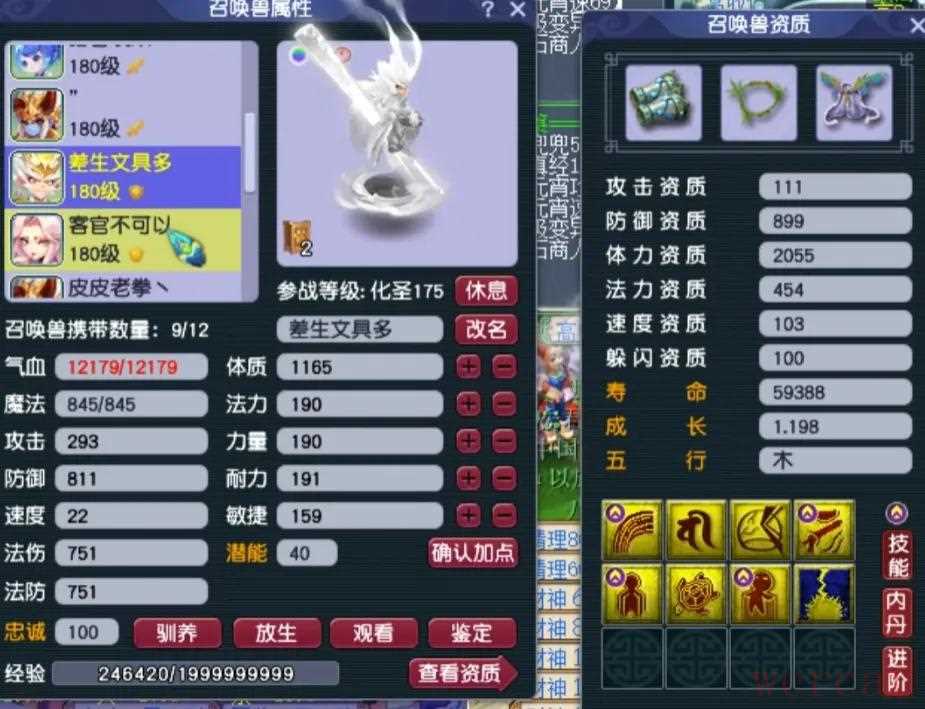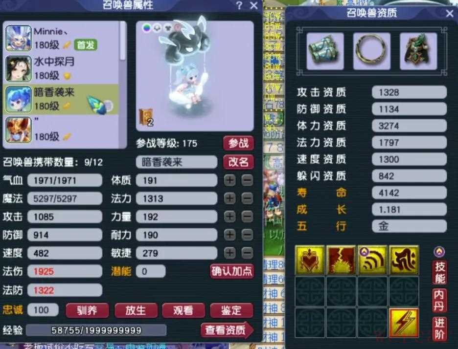 阳玉魄是三法伤,阴玉魄是双防御一气血带3.4%物伤化劲,平均五色灵尘是11级。4、召唤兽展示