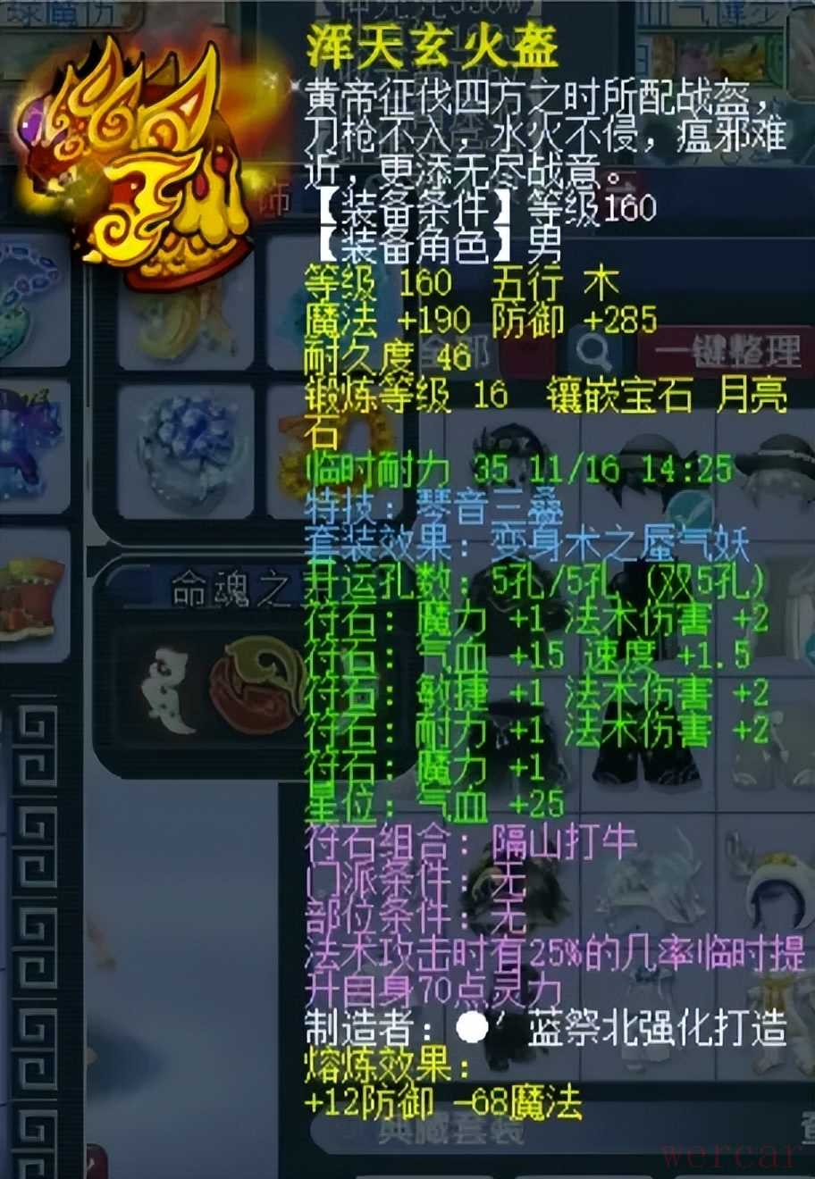 160级琴音头盔,镶嵌16锻月亮石总防297。特技不仅能对目标进行三次法术攻击,还能继承法暴几率,点杀效果非常给力。