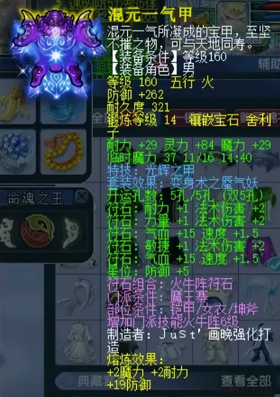 160级光辉铠甲,熔炼后防御281、魔耐双加62,打了14级舍利子。特技可以给单体目标增加防御属性,能够抵挡对手猛烈的输出。3、灵饰&玉魄展示