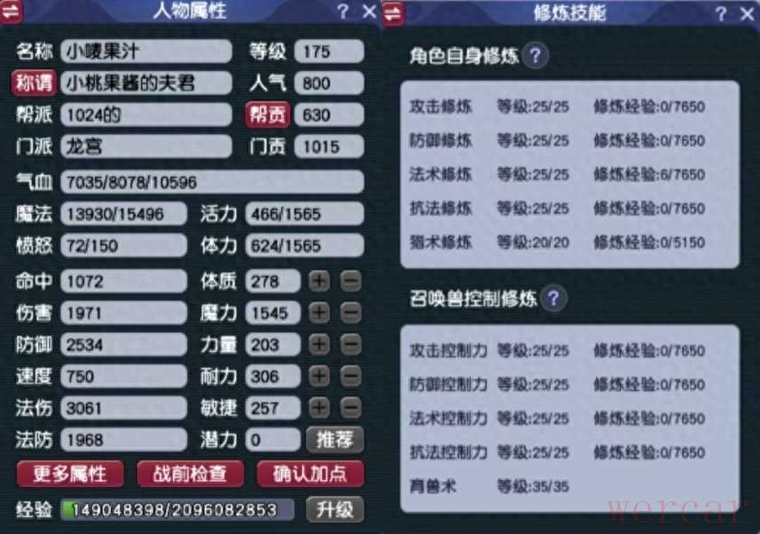 龙宫的全魔加点打符属性,具备2534防、3061法伤和750速度。修炼方面则人修宠修都是满的。