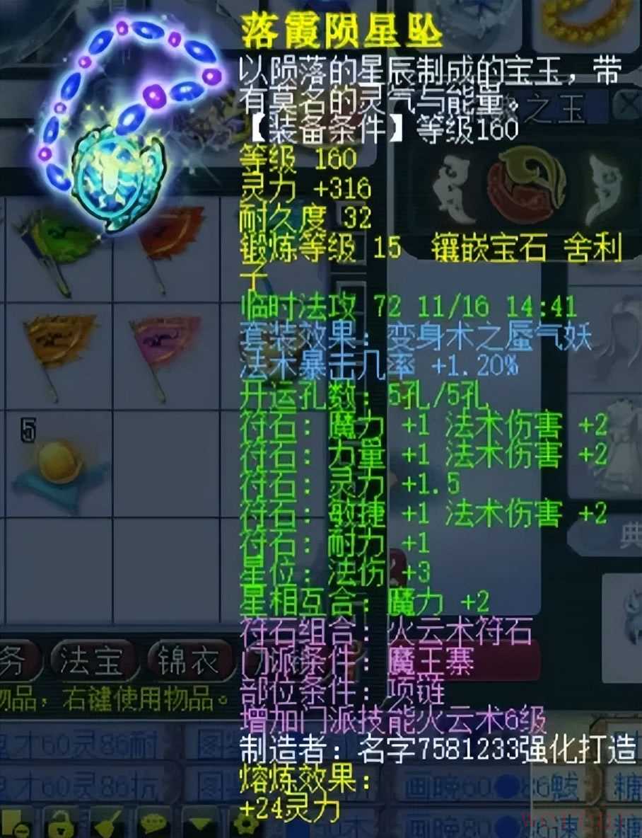 160级法暴几率1.2%的项链,15锻舍利子总灵340。具备优秀的法伤加成之余,还有极限的法暴蓝字,让龙卷雨击更加容易变成绚烂的烟花!