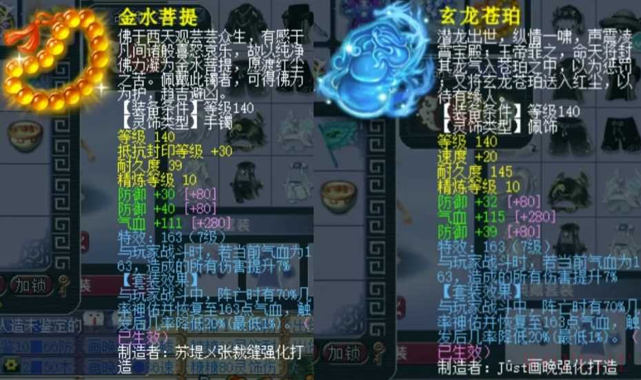 后排灵饰选择四防御双气血。手镯上排抗封30爆2,下排防御共70爆14、气血111爆13;佩饰上排速度20国标,下排防御共71爆15、气血115爆17。