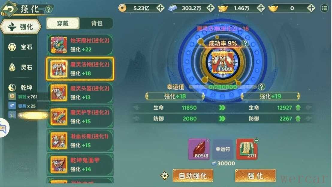 任何强化等级的武器都能自由镶嵌或替换宝石,更换时需用精美的琢玉刀来保留安全性与精度。高级取玉符可在全等级段使用,但主要保护+16以上的装备。在强化失败时,等级只会下降一级,最低保持在+16。乾坤石可镶嵌于武器、防具、首饰等部位,并可在更换装备时无缝继承。它只能通过野外掉落获得,且可交易,是挂机的意外之财。