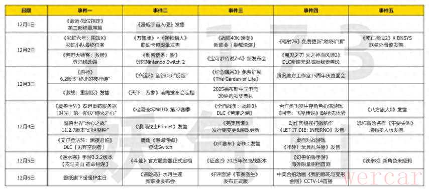 大家好,欢迎收看未来热点全知道的“热点预告”。在这里你将能看到未来一周游戏圈的各项动态,本周我们将会迎来《原神》6.2版本上线;《艾尔登法环:黑夜君临》新DLC上线;《激战:重制版》发售;《银河战士Prime4》发售;《幻兽帕鲁手游》海外限量测试等诸多事件。新的一周又开始了,快来看看游戏圈又有哪些大动作吧。【热点更新】划重点:上线两年半后再提速!《逆水寒手游》年末爽文式大更作为国风MMO赛道中的常青树,《逆水寒手游》在运营两年后并未放缓脚步,反而以更密集的节奏推进内容迭代。12月5日,《逆水寒手游》3.2.2版本【戎马关山 宿命相逢】正式上线,以“20天浓缩体验”为卖点,在剧情、玩法、文化联动等多维度密集发力,节奏快得不像一款已运营两年半的MMO。新版本延续了《十三元凶:生死弈》PV中铺陈的宏大世界观,将无锋门存亡、宋夏纷争与主角身世三条主线交织。玩家将与玄幽宫主米擒负正面交锋,揭开盛家庄旧案隐情,而阮归真与阮阮的师徒对决、戚少商等故人的回归,进一步强化了蝴蝶效应式叙事,角色的选择将直接扰动江湖格局。团本“关山藏锋”迎来最终首领战,搭配荣誉挑战模式;全新竞速玩法“大宋任我行2.0版”融合国风地图与漂移优化,主打轻快上头体验;文化层面,游戏与国家级安塞腰鼓传承人谭海则合作,推出主题动作与语音包。这种多元组合,既满足硬核玩家对副本深度的需求,又以轻量内容覆盖泛用户,体现了《逆水寒手游》在版本内容设计上的丰富与熟练。此次版本被官方定义为“跨年庆典前哨”,20天内密集释放主线、华章、侠游等多线内容,以高浓度体验维持用户活跃度,同时也为即将到来的跨年版本埋下伏笔。划重点:《魔兽世界》【时光服】12月4日,进军熔火之心12月4日,泰坦重铸服务器「时光」第一阶段团队副本:熔火之心将正式开启!在泰坦重铸服务器「时光」中,熔火之心副本将被重铸至80级,并且从40人团队副本变为25人团队副本,对于新老玩家来说都是一次极大的挑战。要进入熔火之心与拉格纳罗斯交锋,玩家需要升至80级,并在黑石深渊入口房间处与洛索斯·天痕对话,将会直接传送至熔火之心。划重点:魔兽世界“地心之战”11.2.7版本“幻世警钟”即将在12月4日正式上线《魔兽世界》12月4日将会更新11.2.7版本“幻世警钟”,开启至暗之夜序章!体验家宅系统、新战役、熊猫人护甲、限时地下城等丰富内容,备战史诗新篇章!划重点:《原神》6.2版本『空月之歌·间奏』“终北的夜行诗”12月3日开启12月3日,《原神》将开启6.2版本『空月之歌·间奏』“终北的夜行诗”。在6.2版本中,卡池分配为上半杜林+温迪+四星雅珂达,下半为瓦雷莎+希诺宁。新内容方面,将会有全新魔神任务、杜林的传说任务、全新世界BOSS以及诸多活动玩法。最重要的是,6.2版本将会新增“魔女的课业”,其中的除杜林外的7名角色,均可以通过各自的小任务得到角色加强,成为魔导角色,命座也会发生变化。划重点:《艾尔登法环:黑夜君临》DLC「见弃空洞者」12月4日上线《艾尔登法环:黑夜君临》DLC「见弃空洞者(The Forsaken Hollows)」12月4日上线!新增学者和葬仪修女角色、两个强大Boss、新地图洞穴和遗迹。划重点:《暗黑破坏神III》第37赛季将于12月5日正式开启《暗黑破坏神III》第37赛季12月5日开启!禁忌档案室主题,卡奈魔盒威能自由混搭,获取第13、25赛季奖励,探索全新流派构筑。划重点:《彩虹六号:围攻X》彩虹小队最终任务12月2日开启《彩虹六号:围攻X》12月2日开启最终任务!Thatcher重制、堡垒地图升级、新武器上线,体验第十年颠覆性赛季。划重点:《命运-冠位指定》第二部终章序篇12月1日开启FGO日服12月1日开启第二部终章序篇,全幕间物语限免且0AP消耗!完成主线任务可获圣晶石奖励,术阶冠位战12月3日启动。划重点:《万智牌》×《怪物猎人》联动卡包12月2日限量发售《万智牌》×《怪物猎人》联动卡包12月2日限量发售!包含4种主题组合包,经典怪物和猎人武器登场。划重点:《战锤40K:暗潮》"巢都渣滓"职业预告 12月2日上线《战锤40K:暗潮》新职业「巢都渣滓」12月2日上线!体验双持枪械、化学强化与独特外观定制,探索本土势力剧情。划重点:《全面战争:战锤3》DLC《苦难之潮》12月4日上线《全面战争:战锤3》DLC《苦难之潮》2025年12月4日上线!三位传奇领主Aislinn、Dechala和Sayl登场,带来全新策略体验。划重点:《辐射76》免费更新“燃烧矿镇“公布!12月2日上线《辐射76》免费更新“燃烧矿镇”12月2日上线!探索新沙漠生物群系,接受赏金任务,解锁传奇道具和独特模块。划重点:《命运2》全新DLC"反叛"将于12月3日发布Bungie将于12月2日发布受《星球大战》启发的《命运2:反叛》(Destiny 2: Renegades)扩展包。划重点:《纪念碑谷3》免费扩展《The Garden of Life》将于2025年12月3日上线《纪念碑谷3》免费扩展《The Garden of Life》2025年12月3日上线!新增4个章节、隐藏谜题,扩建村庄,体验最具启发性的视觉解谜。划重点:《完美音浪》发行商正式由B社变为KRAFTON 并将于12月4日更新KRAFTON宣布,节奏动作游戏《完美音浪》的服务运营主体从Bethesda Softworks(B社)变更为KRAFTON。并且将于12月4日对游戏进行更新,此次更新仅是更改游戏中的版权标志显示项目。划重点:《斗仙》官方服务器正式定档12月5日网游《斗仙》官方服务器将于12月5日正式上线。划重点: