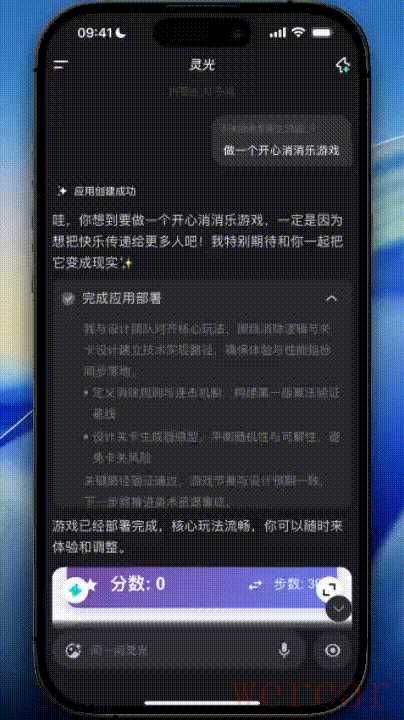 提示词:做一个开心消消乐游戏可以看到,灵光接受到请求后,开始设计、构建游戏界面框架、开发,甚至最后直接应用部署,30 秒就出来了一个可以直接玩的开心消消乐。