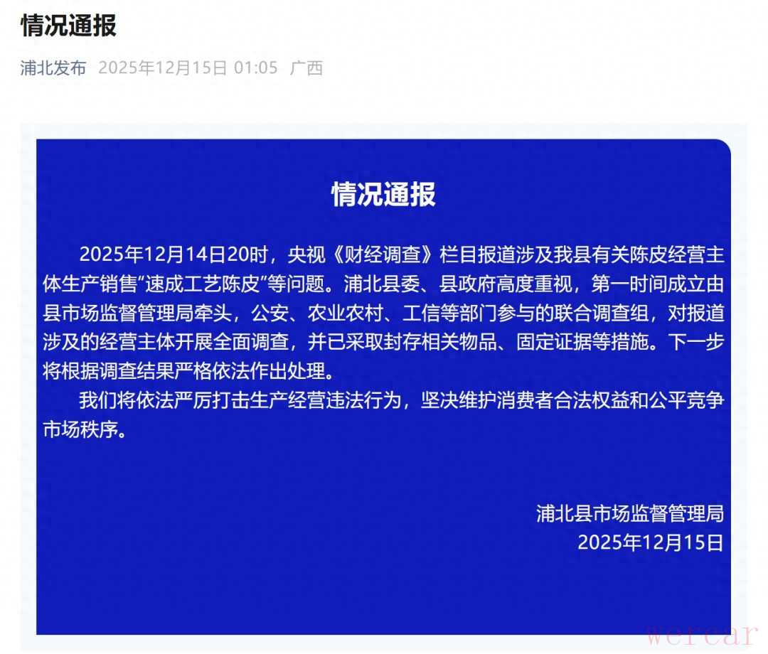 2025年12月14日20时,央视《财经调查》栏目报道涉及我县有关陈皮经营主体生产销售“速成工艺陈皮”等问题。浦北县委、县政府高度重视,第一时间成立由县市场监督管理局牵头,公安、农业农村、工信等部门参与的联合调查组,对报道涉及的经营主体开展全面调查,并已采取封存相关物品、固定证据等措施。下一步将根据调查结果严格依法作出处理。