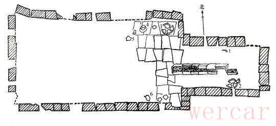 南坛蜀汉墓平面图。1陶灯。2、3陶盔形器座。4-6残陶器。