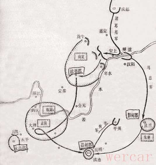 南征之初,诸葛丞相的目光聚焦到了越嶲郡,即今天的凉山。当时南中最有势力的三大部落雍闿、孟获和高定的军队都汇集于凉山,本着擒贼先擒王的思路,诸葛丞相当即决定发兵凉山,直捣西昌。从成都出发后,诸葛亮率部队由当时进入凉山的唯一通道,星夜兼程,走僰道(今宜宾),渡马湖,尔后走旱路自东向西横穿大凉山,途经今日凉山州的雷波、美姑、昭觉等县,最后抵达西昌,并于现西昌市经久乡一带驻扎下来。