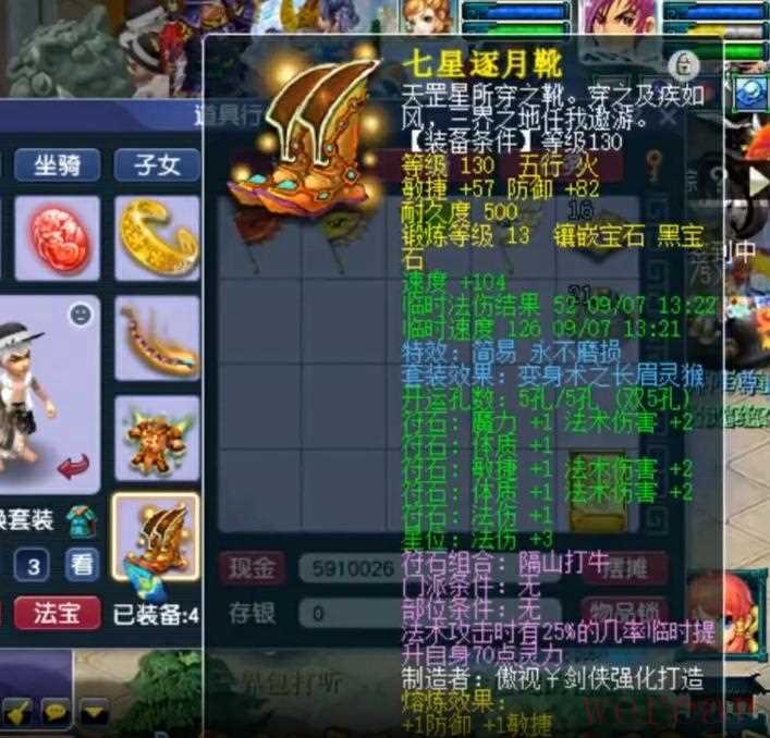 鞋子:130简易+不磨+长眉灵猴鞋子,这个鞋子的核心在于敏捷,几乎达到了130鞋子敏捷的上限