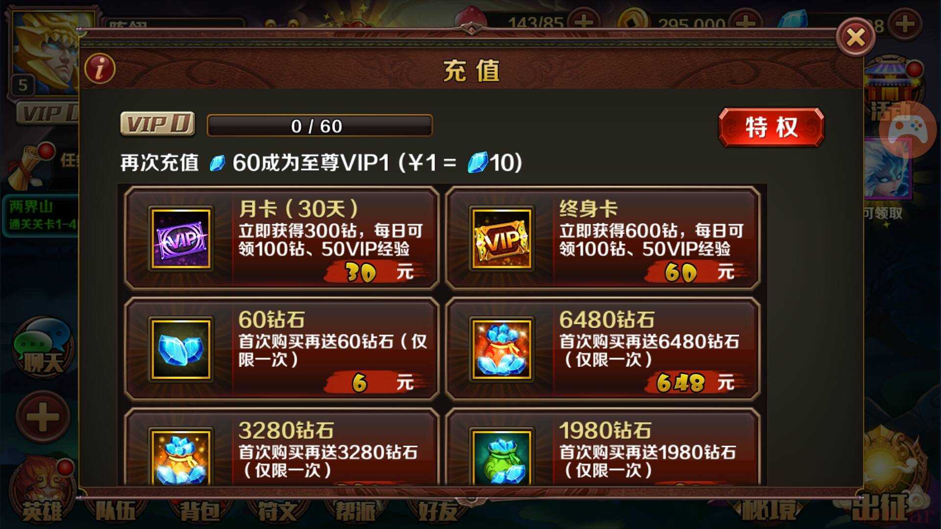 钻石在游戏中的获取就没有金币那么容易了,除了日常的福利性活动外,如果玩家再想额外获得钻石就要进行充值了。对于小R玩家来说购买月卡和终身卡将是一个不错的选择。月卡价值30元,购买后可立即获得300钻石,并且在之后的一个月内每日可领取100钻石。终身卡更为实惠,价值60元,购买成功立即获得600钻石返还,并且每日可领取100钻石终身有效。如果玩家急用钻石,且资金充足的话,那直接充值就是最好的选择了。人民币与钻石之间的兑换比率为1:10,游戏共为玩家提供了从6元到648元不等的6种套餐,可根据自身需求自行选择,并且每种套餐的首次充值都能获得双倍钻石的奖励。