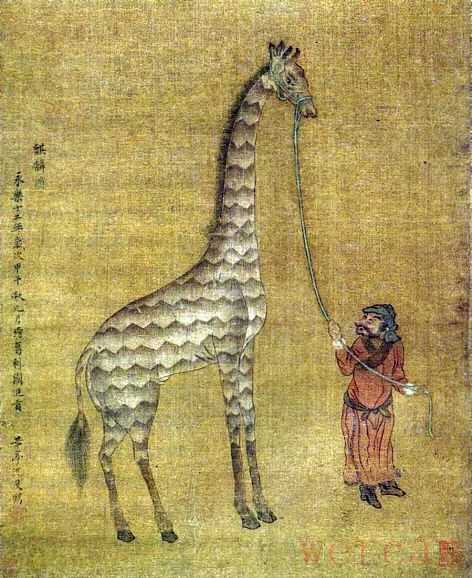 法国学者阿里·玛扎海里的《丝绸之路——中国—波斯文化交流史》中指出明朝经常有携带“奇兽”的使节,更像是一个流动的马戏团或杂技团。他们经常护送鸵鸟、猞猁狲和经过狩猎训练的豹子入朝,最多的还是中国人很难见到的狮子。明朝沿袭东汉和唐朝的旧例而怀有极大的兴趣接受这些笨重的贡物,并赏赐丝绸、大隼等中国的土产。在紫禁城中有一个辽阔的万牲园,他们在那里饲养了非常多的动物,“有数百头各国国王进贡的狮子”。也激起了许多儒家学者的反对,但是,他们的抗议却徒劳无益,因为对明王朝来说,这是一个有关威望的简单问题。通过观赏这一异域进贡的奇兽形象,建立起对于政治权威的认同感和畏惧感,包括政治上层的下属以及普通民众,使他们在观赏这一异兽的过程中,因为个体对于自然界动物秩序的感受也参与其中,逐渐构建出一种对于政治权威的恐惧感和敬畏感。这种象征,不仅仅存在于政治上层所设定的典章制度的层面,也对普通民众的观念和行为予以很多影响、规劝和震慑。明代中叶,皇帝确实有一个满是珍禽异兽的“御苑”,夏原吉《夏忠靖公集》卷三有对这一规模不小的万牲园的描述:“洪熙乙巳秋仲,赐观内苑珍禽奇兽,应制赋诗”:“爰开禁籞集廷臣,少肆余闲阅奇蓄。时维秋仲天气清,纤尘不起香风轻。虞官圉宰杂沓进,珍禽瑞兽纷纭呈。狻猊侧居真雄猛,钩爪金毛睛炯炯。彩球戏罢拂霜髯,百兽潜窥敢驰骋。须臾玄鹿来轩墀,丰肌黭黮犹乌犀。若非食野沾煤雨,应是寻泉堕墨池。双羊继出仍珍美,腹若垂囊背如砥。煌煌宝辔经笼头,轧轧朱轮低载尾。花阴大小霜姿猿,金环约项声隆然。盘旋倏忽作人立,何殊雪洞飞来仙?又看福鹿并神鹿,毛质鲜庞实灵物。羚羊缓步苍苔边,修角撑空亦奇独。柙中玉鼠洁且驯,朱樱贯目脂涂唇。想应窃饵琼芝足,故着银袍觐紫宸。驼鸡耸立谁其侣?骈趾青瞳高丈许。或时振翼将何如?志在冲霄学鹏举。徘徊重睹花斑鸡,冠丹颊翠衣裳缁。是谁巧把晴空雪?散作身章若缀璂。载欣载羡双鸠鸟,质傅铅花光皎皎。雄雌并立清飙前,贞静幽闲一何好。”文中提到的“毛质鲜庞”之灵物“神鹿”,或指长颈鹿。