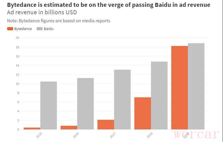 图片为2015-2019,字节跳动与百度营收对比,单位为十亿美元;数据来源:Company filings、China Channel、The Information、Late Post、Sina Tech、Reuters、36kr;图片来源:TechNode
