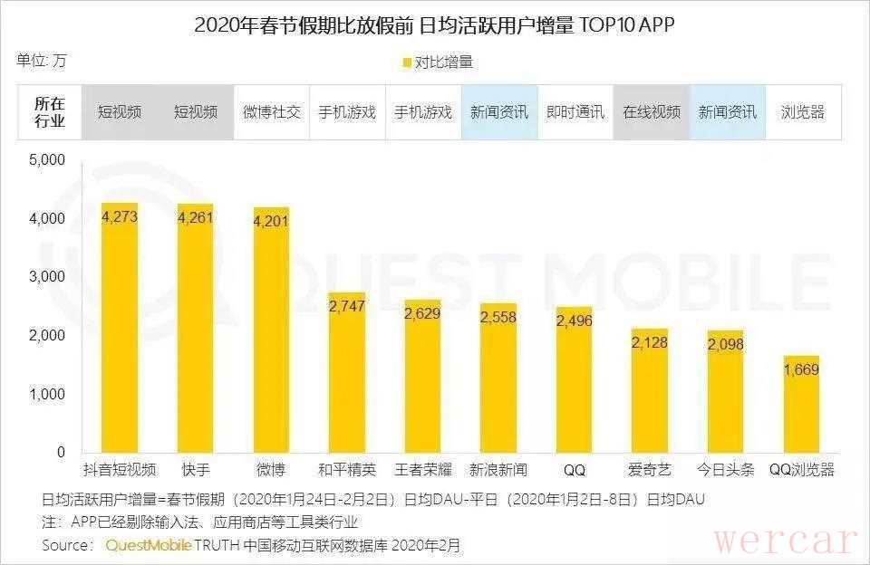 春节期间,国内大量民众因不能外出,宅在家,需要消耗精力。数以万计的用户涌向游戏、短视频应用,让两者成为最受欢迎的产品。从下图QuesMobileTRUTH披露的数据可以看出,短视频、社交工具、游戏日活量最高。