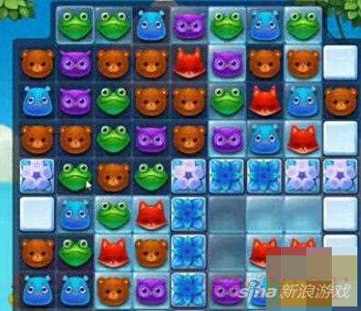 如上图所示:这就是打开一个通口会局面发生的变化,接下来就是多制造特效,移动青蛙,完成4L相连特效,在还能制造成其他会发光的小动物时,特效可以稍等片刻再引爆,2个特效相连,可以完成十字消除效果,威力很大。