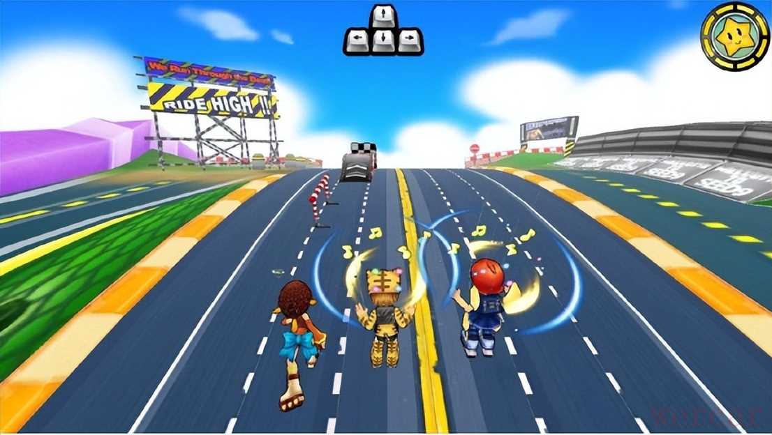 同样得益于这套被融入进来的竞速系统,《音速觉醒》得以在传统音游四向按键操作的基础上,添加栏杆(长按方向键↑ + ←/→空格),跳台(二段跳双击方向键↑),转向滑板(随机键组合长按方向键↓ + ←/→)等一系列特技动作,既丰富了游戏的视听体验,又增加了游戏操作难度的上限……呃,在某种程度上也是为它最终命运埋下了小小的伏笔。