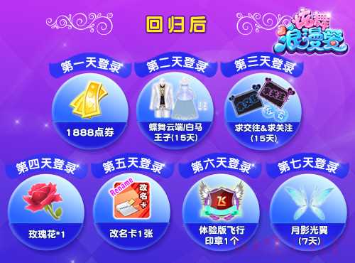 王者归来,回归玩家登录游戏,即可从活动中领取回归大礼,1888点卷,改名卡,多种道具服饰,住你重归王者巅峰。每日好友回归,也能获取点卷和光环奖励。